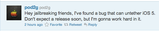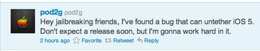 2 hours ago, pod2g tweeted that he has found a bug that will untether iOS 5! He will be working on it to release it as soon as possible, however, as he says, it will not be anytime soon.
