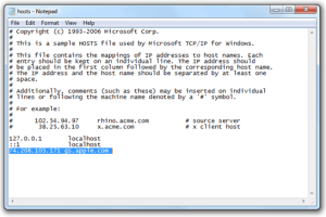 Open hosts file with the text editor then add the following code to the end of the file :