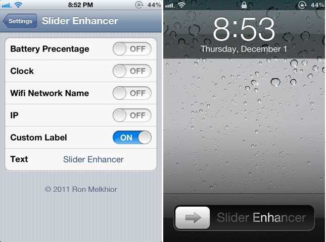 Are you sick of the native “Slide to Unlock” text on your iPhone’s Lockscreen? Do you want to replace it with custom text? Or with the Battery Percentage? A young Cydia tweaks developer, name Ron Melkhior, have released a tiny tweak in the cydia to sort out this problem. Slider Enhancer will let you to change the boring slide to unlock text. No new icons will added on your homescreen. However, you can customize the text in the settings. Under settings, there are five options. You can replace this text with Battery Percentage, Clock, Wifi network name, IP address or with Custom Label.