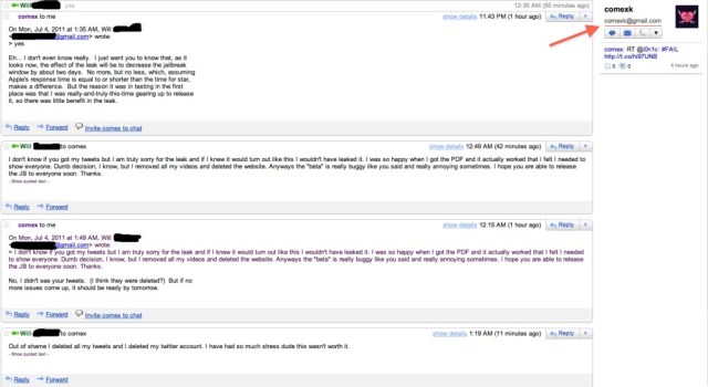 “As a few of you know, comex wanted to talk to me by email. This is an exact copy of the emails to me. It appears that he confirms the JB release date. This may be a setup by him of some sort so take it as you want.”